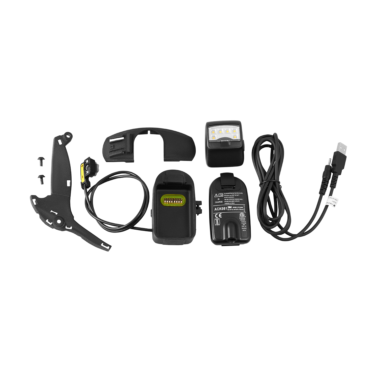 Complete werklampkits en onderdelen voor de 3M™ Speedglas™ Lashelm G5-01 en G5-03, zoals lamp, beschermplaat, bevestigingsonderdelen en kabels.